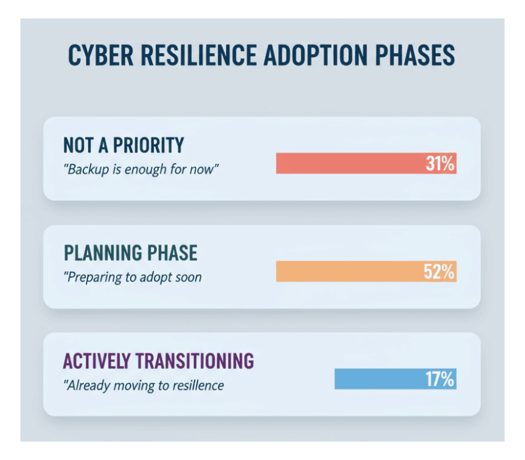 - Only 17% are actively transitioning to data resilience strategies—there’s a massive readiness gap requiring immediate attention