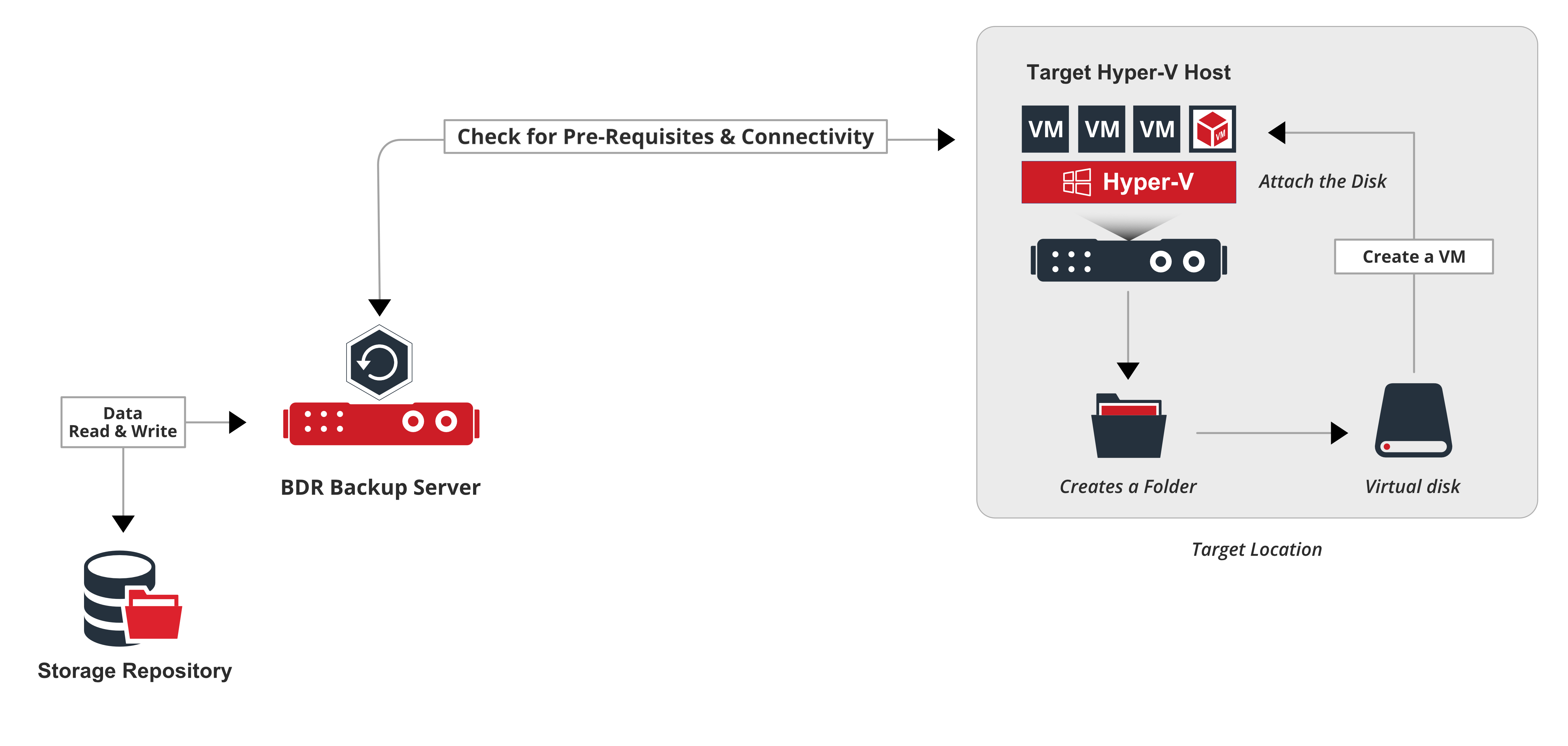 - Once you trigger the restore process, Vembu BDR backup server checks for the prerequisites and does the connectivity check in the Target Hyper-V Host.