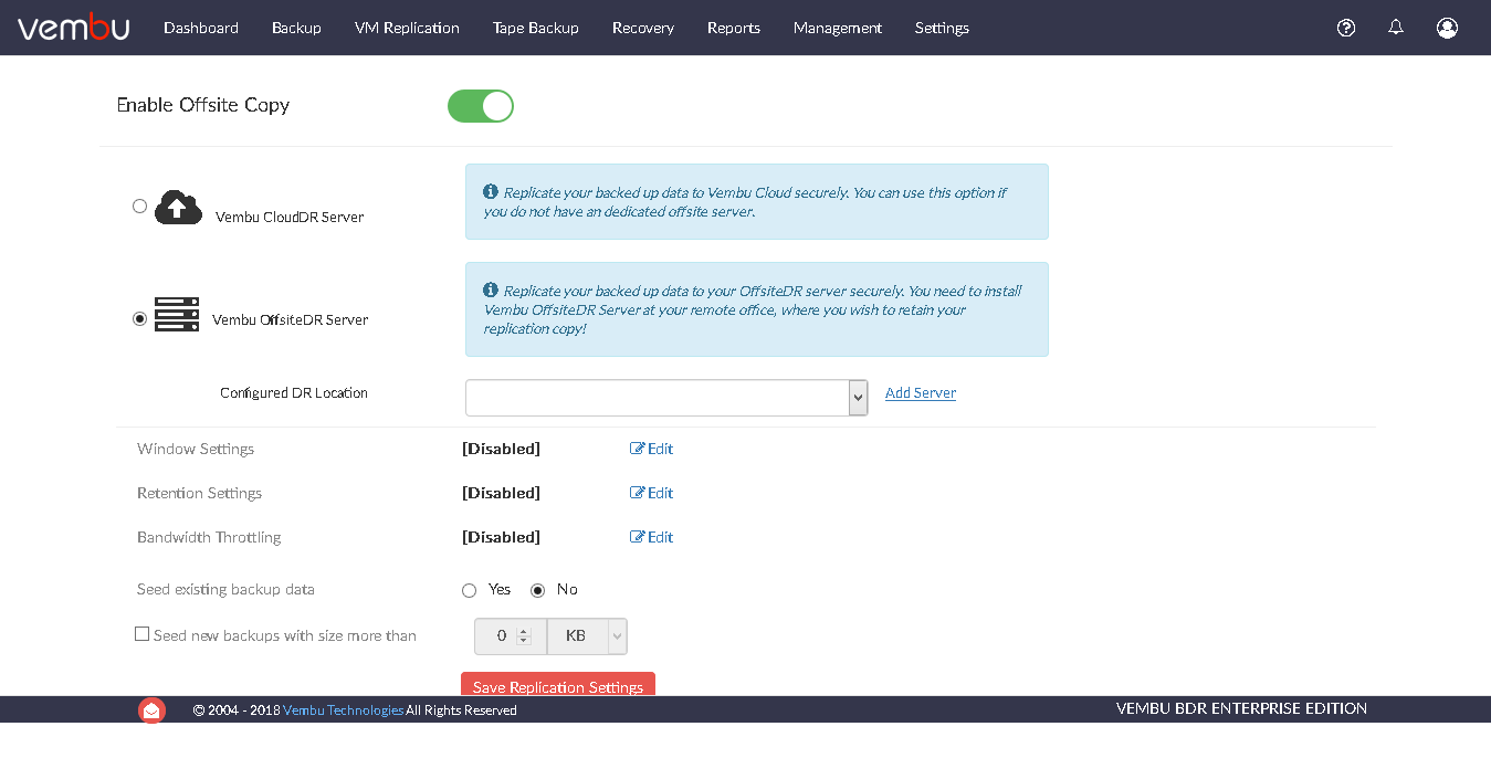 - Vembu CloudDR - Replicate your backup data to Vembu Cloud Securely. Use this option if you don't have a offsite server.