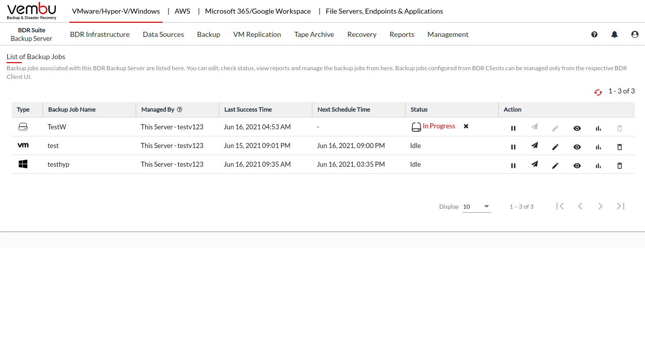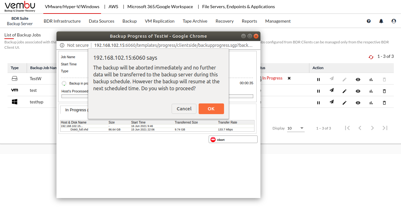 • You have the option of aborting a backup when it is in progress. You can abort the backup either from the Status Section in the List Jobs page or from the backup progress window.