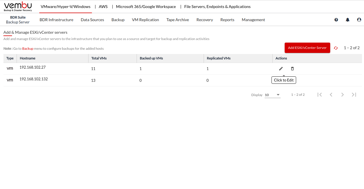 You can also delete the added VMware vCenter/ESXi Servers by clicking on the Delete icon.