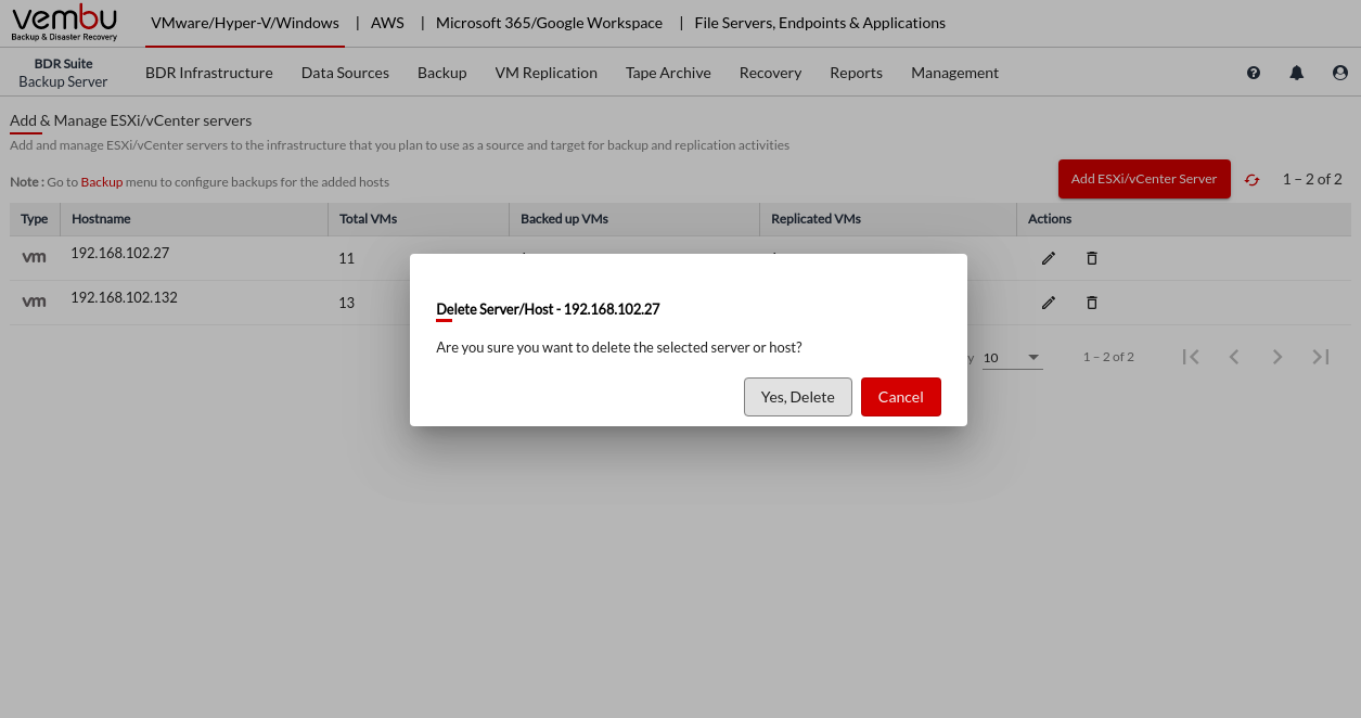 By clicking on 'Yes, Delete' the added host will be permanently removed from the Vembu BDR Backup Server.