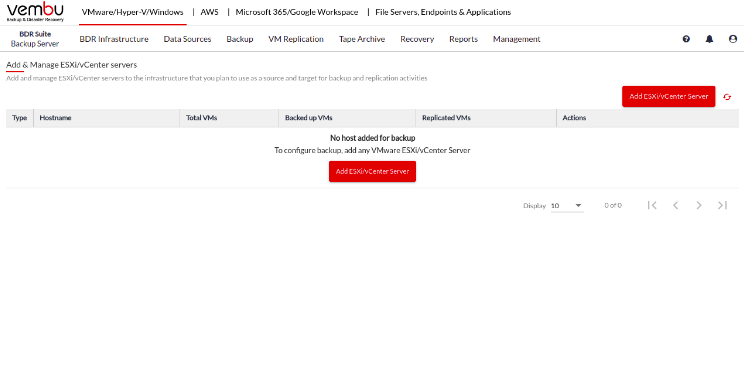 Step 2: Click Add ESXi/vCenter Server to add your ESXi or vCenter to the Data Source of your Vembu BDR Backup Server.