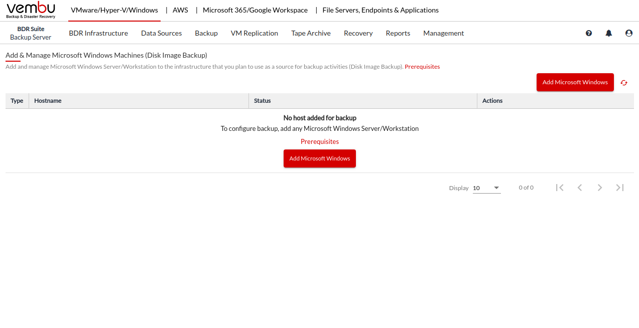 - You must add a Windows Server before you begin configuring the backup schedule. In the Data Sources tab choose 'Add Microsoft Windows(Disk Image Backup). You will be taken to a page where you will see a message stating 'No host added for backup' if you adding host for the first time. Click on 'Add Microsoft Windows'