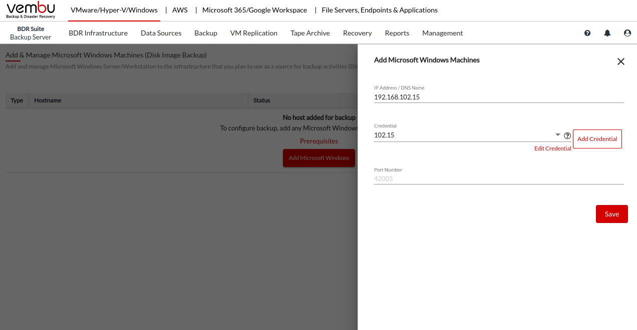 When a Microsoft Windows server/workstation is added to the BDR Backup server, a Vembu Backup Agent (VBA) is automatically installed in the target machine. In order for the agent to be installed, certain prerequisites are to be met by the Windows target machine. Check for the Prerequisites to Add Microsoft Windows, if already done then you can follow the below steps to add the Microsoft Windows server/workstation.