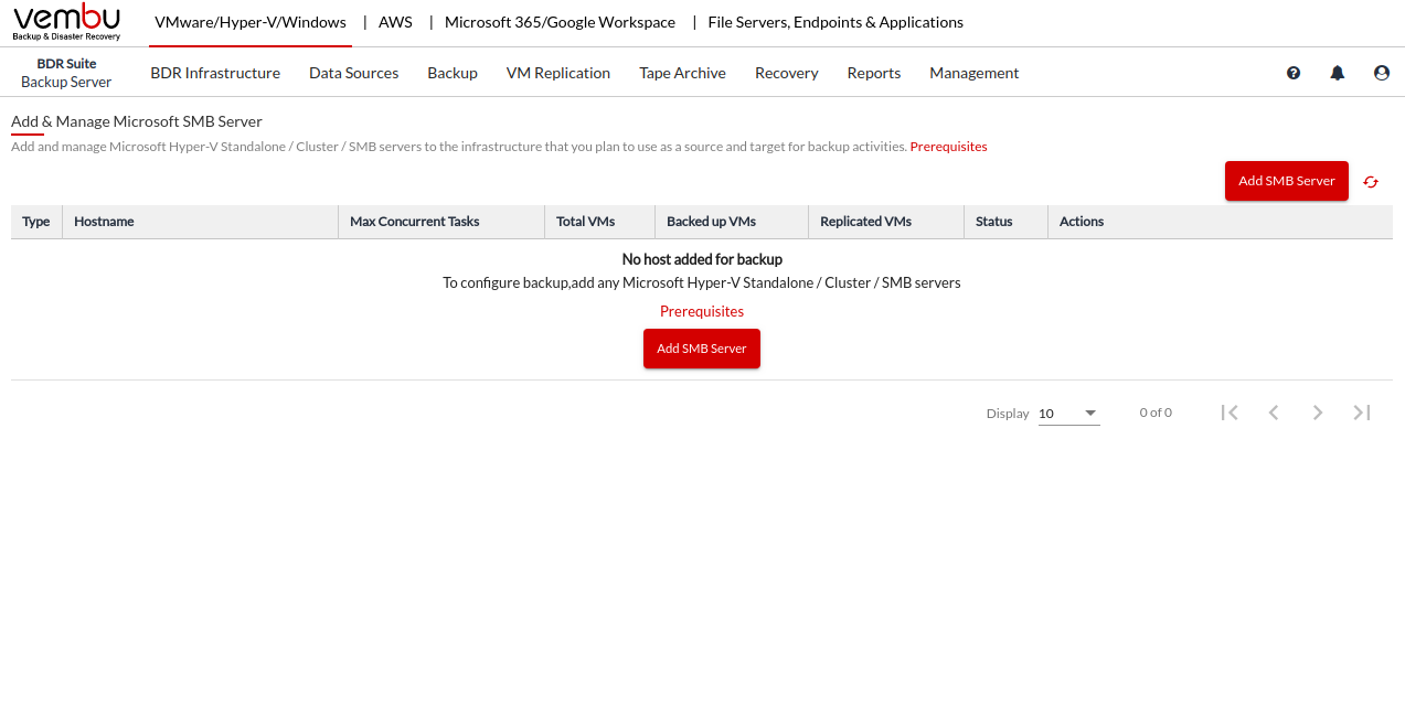 Step 2: Click Add SMB Server to add your SMB server to the production infrastructure of your Vembu BDR Backup Server.