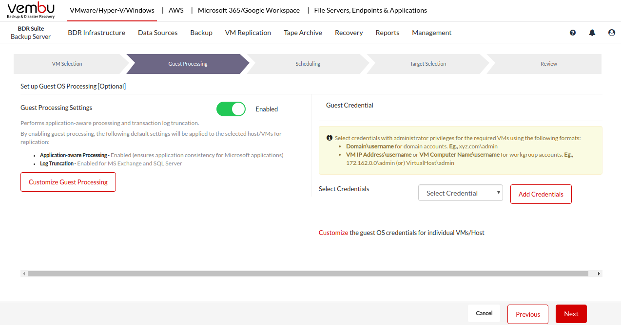 Vembu BDR Suite » Backup & Replication for Microsoft Hyper-V » Configure VM Replication » Guest Processing Settings » Configuring Guest Processing Settings