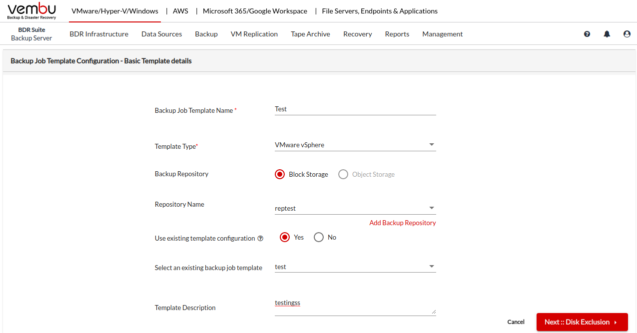 Configuration of backup jobs involves a series of steps to be followed. Every organization based on requirements sticks to a particular format of settings or chooses to customize. If the former is the case then you can use this feature from Vembu to create a backup job template. You will be able to make use of this template while configuring new backup jobs which require similar configuration settings as that of the already created template. Thus enabling you to skip steps every time you configure a backup.