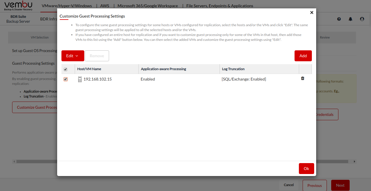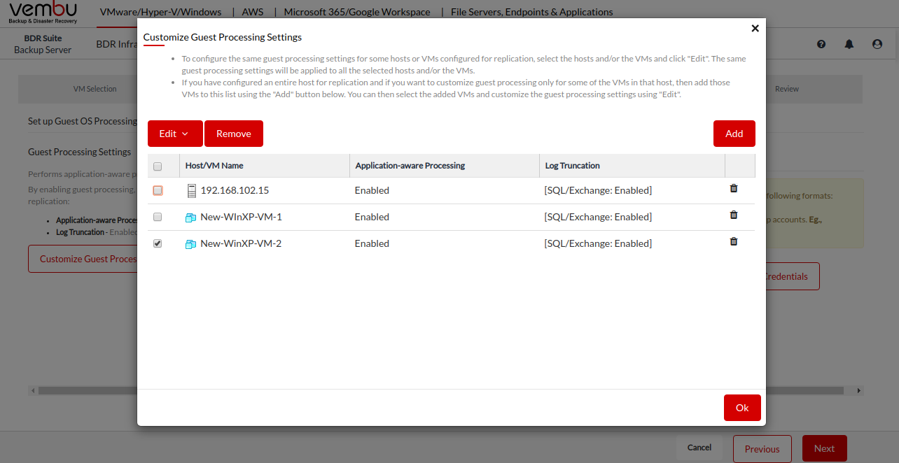 You can then select the added VMs and Hosts, and customize the guest processing settings by clicking on the Edit button.