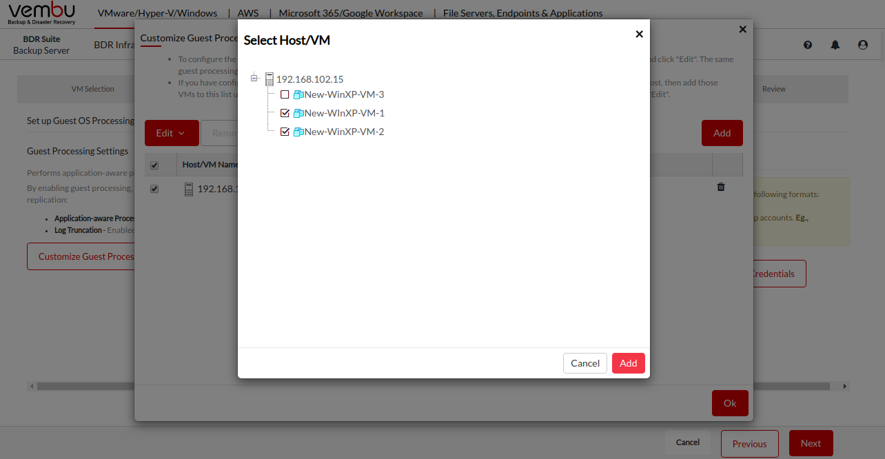 Select the VM to which you want to customize the guest processing setting, and click on Add button