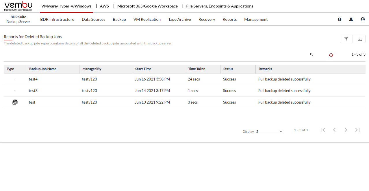 Share: vembubdrsuitebetauserguide Deleted Backup Jobs Vembu BDR Suite » Reports » Backup Job » Deleted Backup Jobs Deleted Backup JobsThe deleted backup jobs report contains details of all the deleted backup jobs associated with this backup server.Next Previous