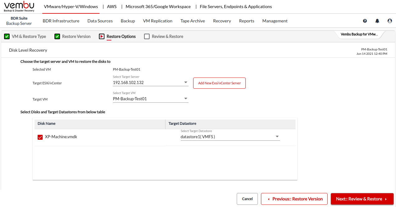 On the same page select the Disks and Target Datastore to which the backup data is to be recovered.