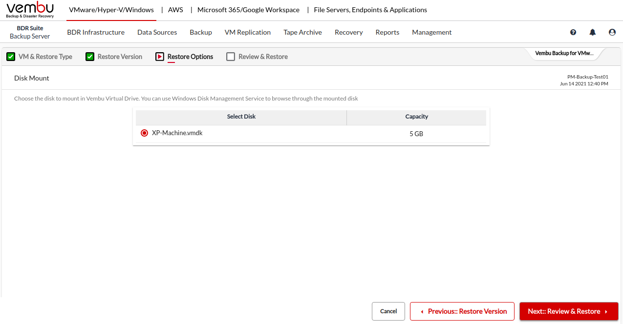 The Disk Mount Recovery option mounts the backed-up VM’s disk to the Disk Management Service of the Microsoft Windows machine on which the Vembu BDR Backup Server is hosted; it is done through Vembu Virtual Drive that grants access to your backup data instantly through the file explorer, without having to restore the entire backup.