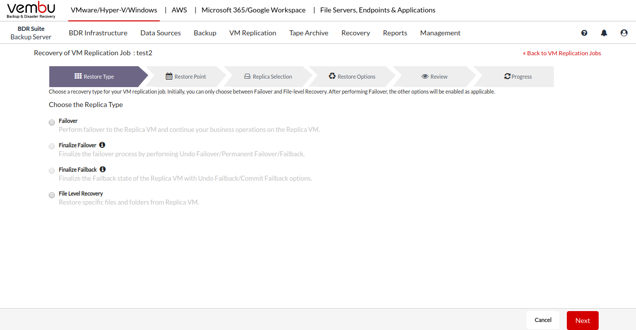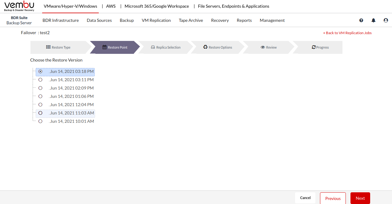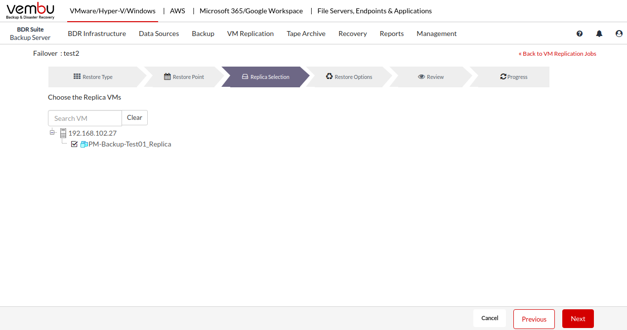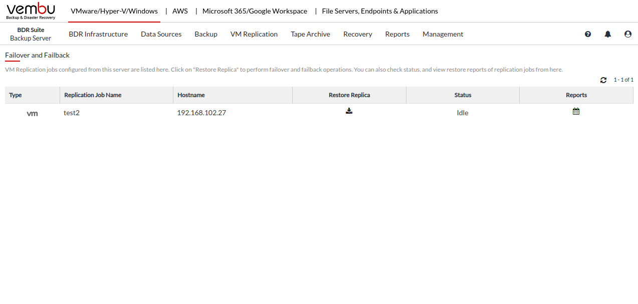 - Select the VM Replication tab and choose the Failover and Failback option. Click the Restore icon beside the required replication job.