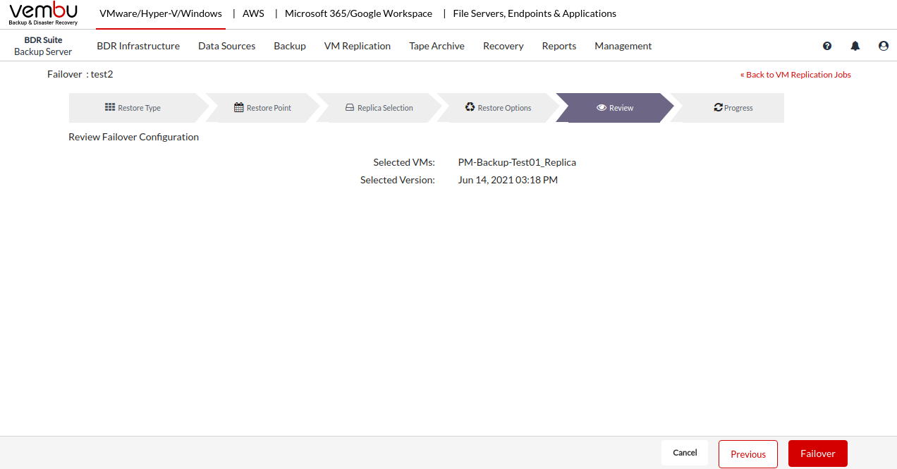 - You can Failover the replica to any restore point available. If any data is added when the VM is in the Failover state, it will be maintained separately in a snapshot delta file.