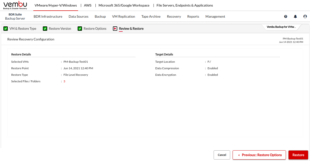 Review the recovery configuration you have selected and click on Restore to start restoring the selected files & folder.