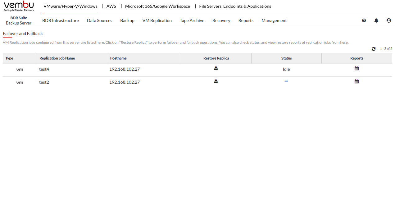 - Choose the VM Replication tab and select the Failover and Failback option.