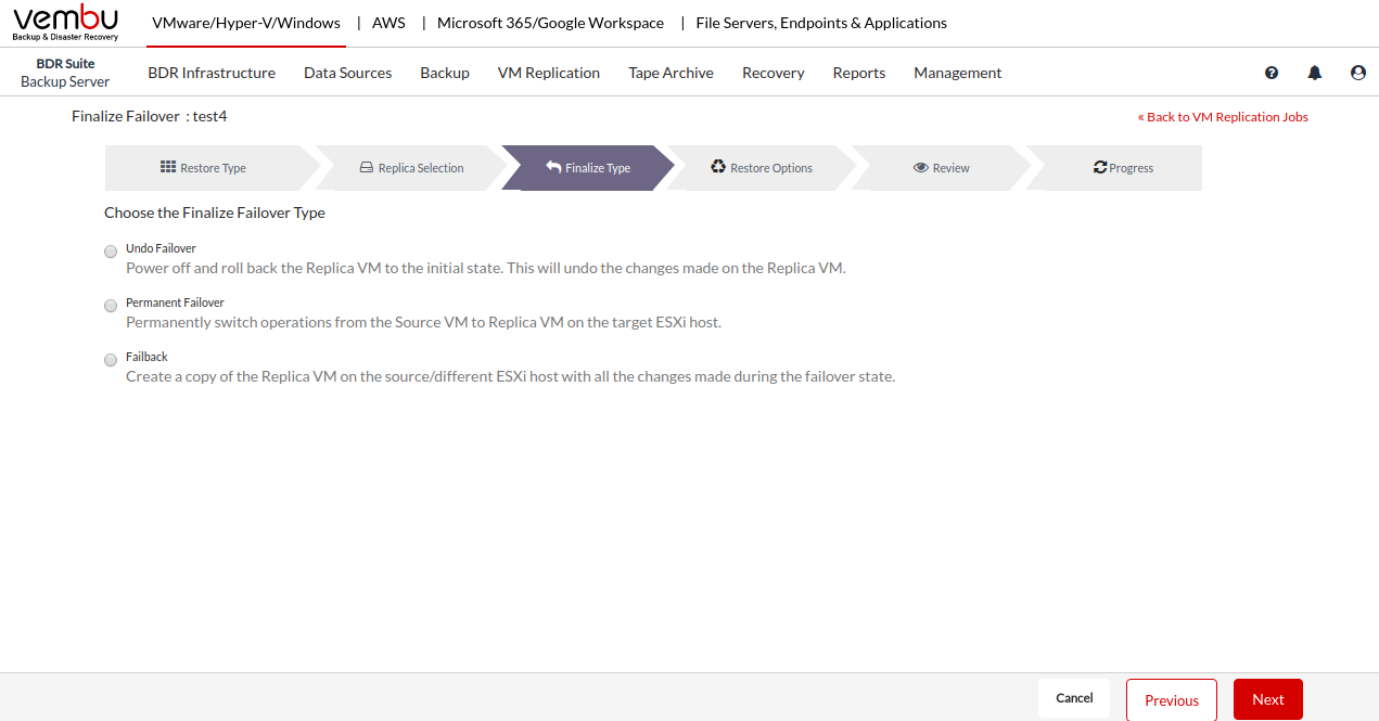 Vembu BDR Suite » Backup & Replication for VMware » Replica VM Failover and Failback » Finalize Failover