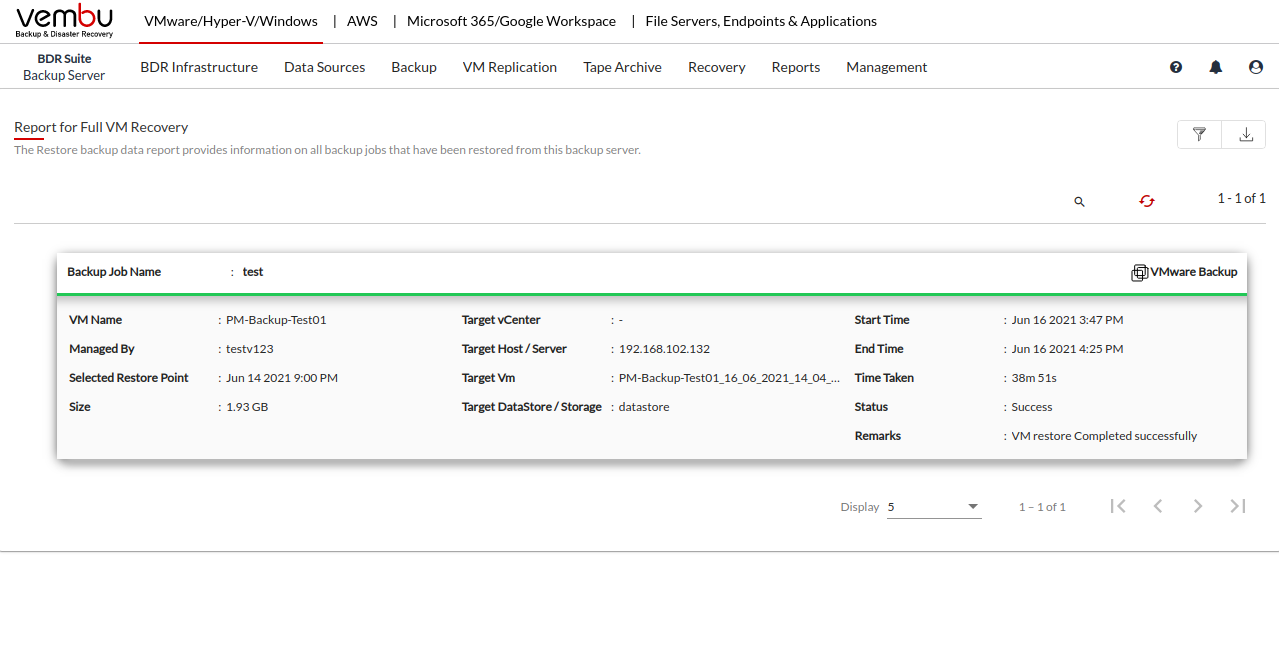 Vembu BDR Suite » Reports » Data Recovery » Full VM Recovery