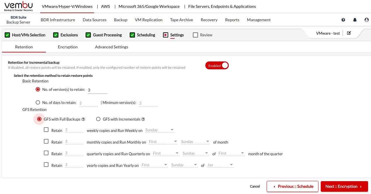 Vembu BDR Backup Server marks the GFS flag against the Additional full or Synthetic full backups or incremental backups.