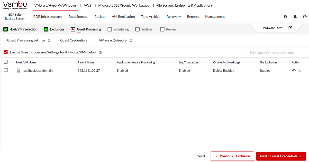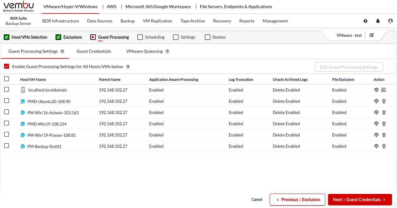 To customize the guest processing settings of the VMs or the Host, you have to select the checkbox corresponding to the Host/VM Name and click the Edit Guest Processing Settings button on the right side of your screen.