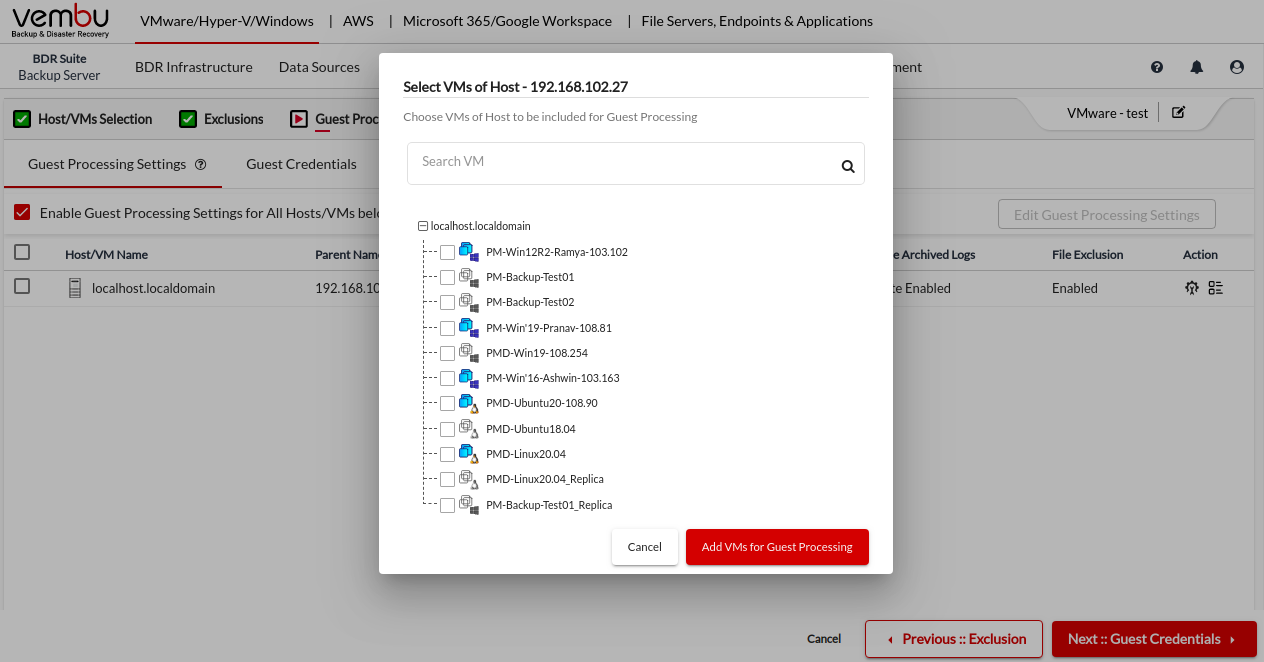 If you are selecting the entire ESXi host or vCenter server for a backup, and if you want to customize the guest processing setting for the individual guest VMs, Click on the List icon in the action column corresponding to the ESXi host or vCenter server and select the VM & click Add VMs for Guest Processing button.