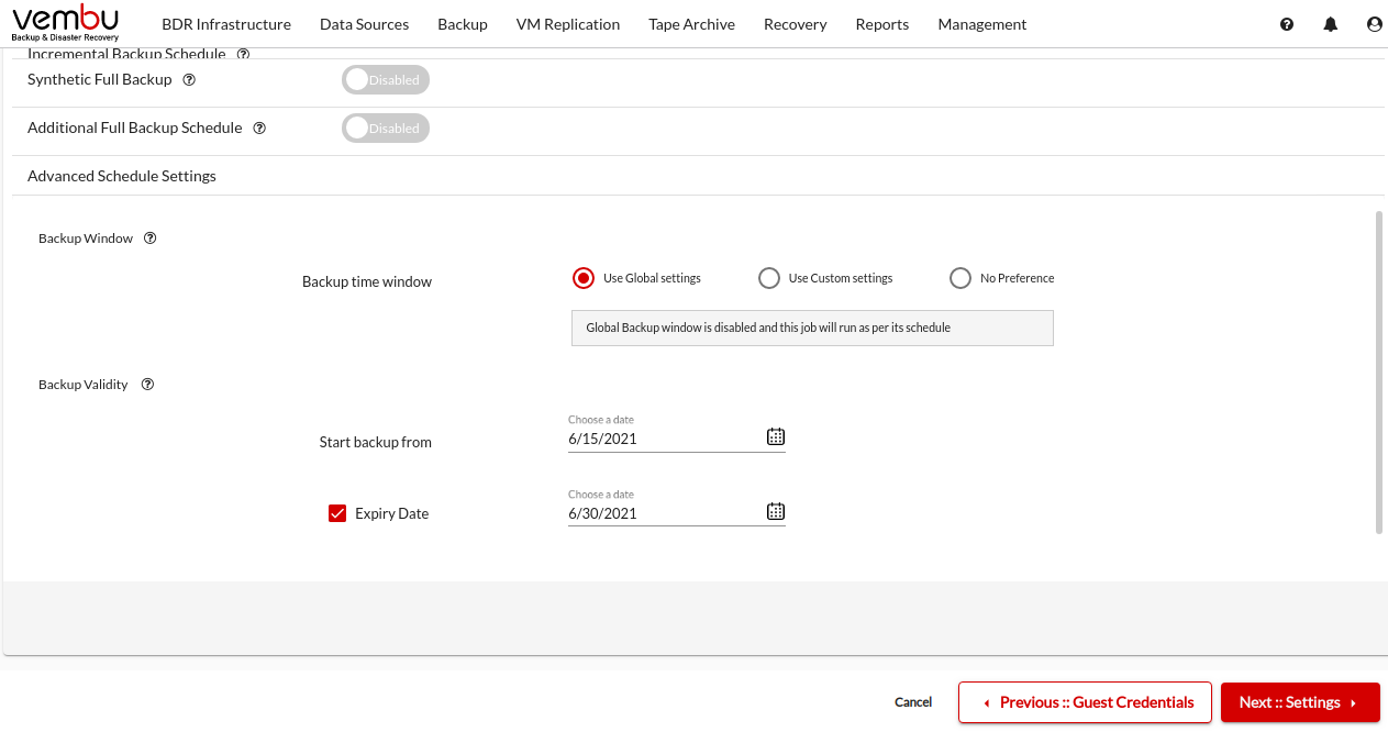 The Advanced Schedule Settings allow you to specify the Backup Window time and Backup Validity for your backup job.