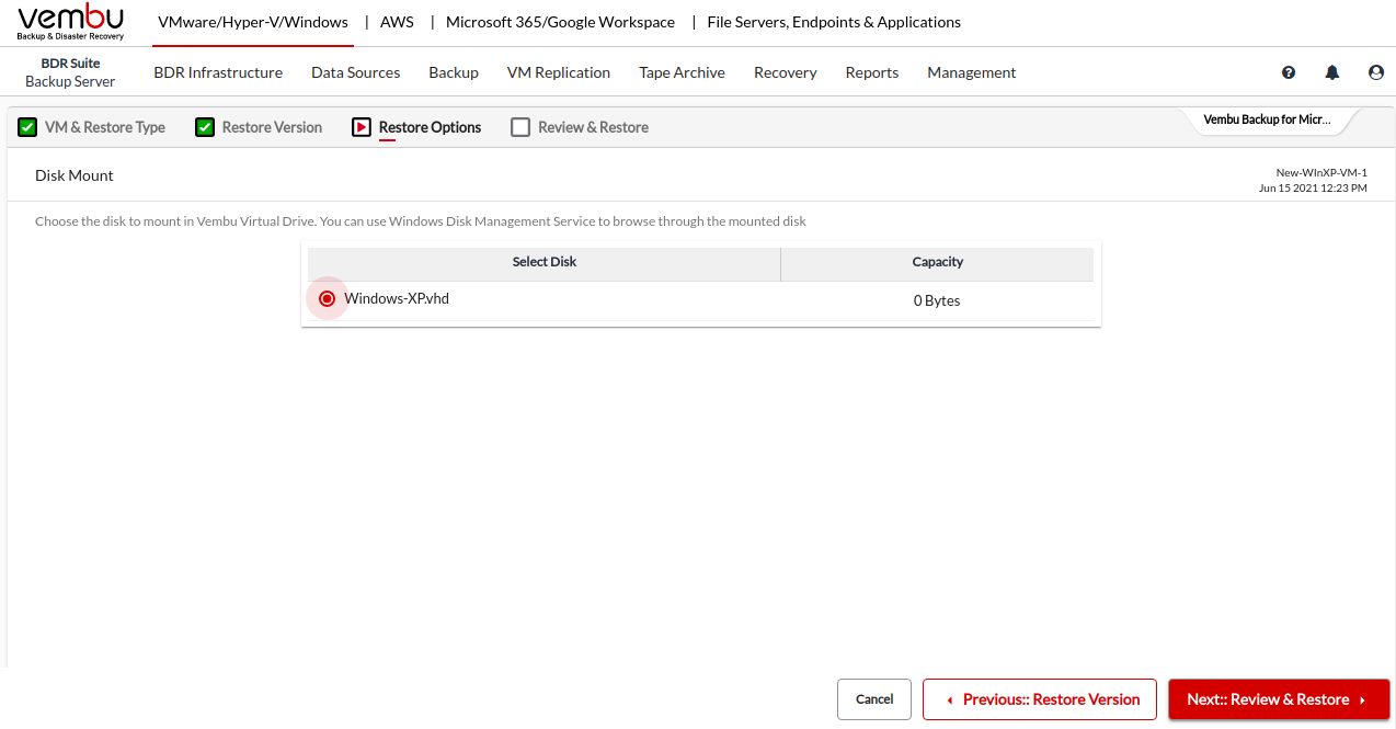 Select a restore point to restore the backup data. Vembu BDR Backup Server retains the restore points as per the retention policy you have selected for the backup job.
