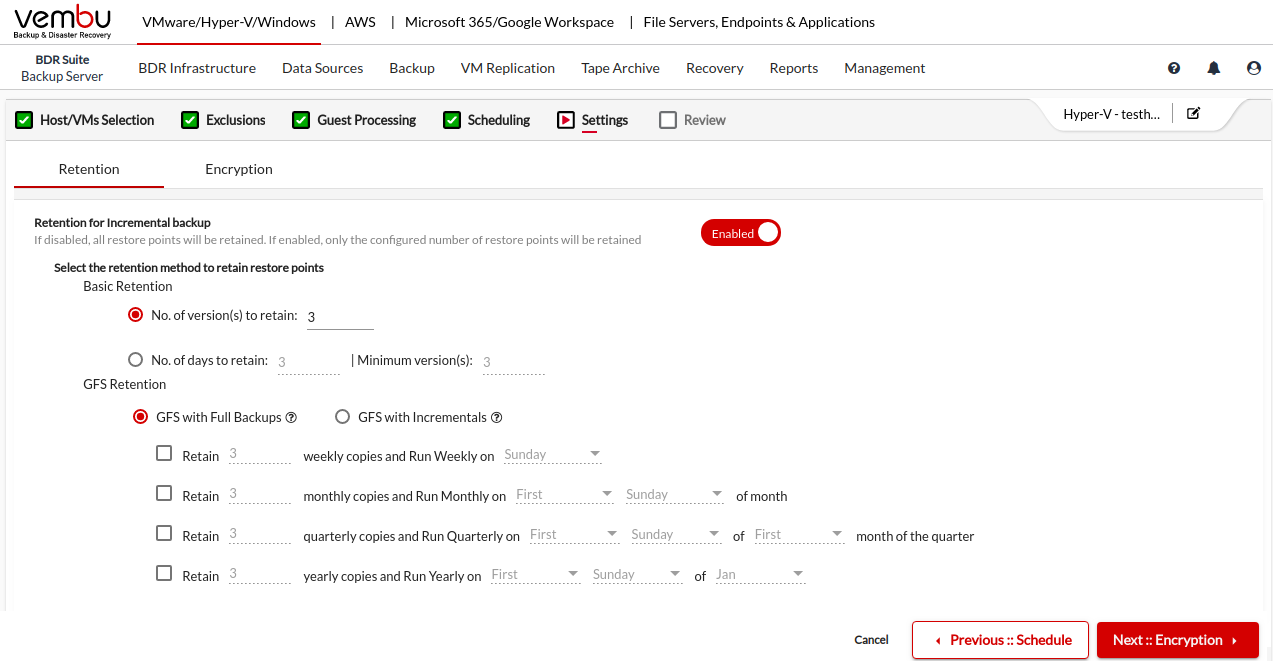 Vembu BDR Backup Server marks the GFS flag against the Additional full or Synthetic full backups or incremental backups.