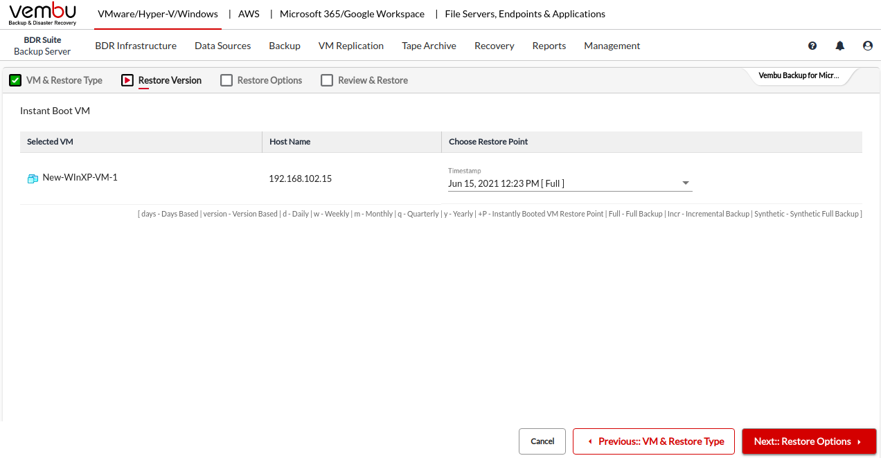 Select a restore point to restore the backup data. Vembu BDR Backup Server retains the restore points as per the retention policy you have selected for the backup job.