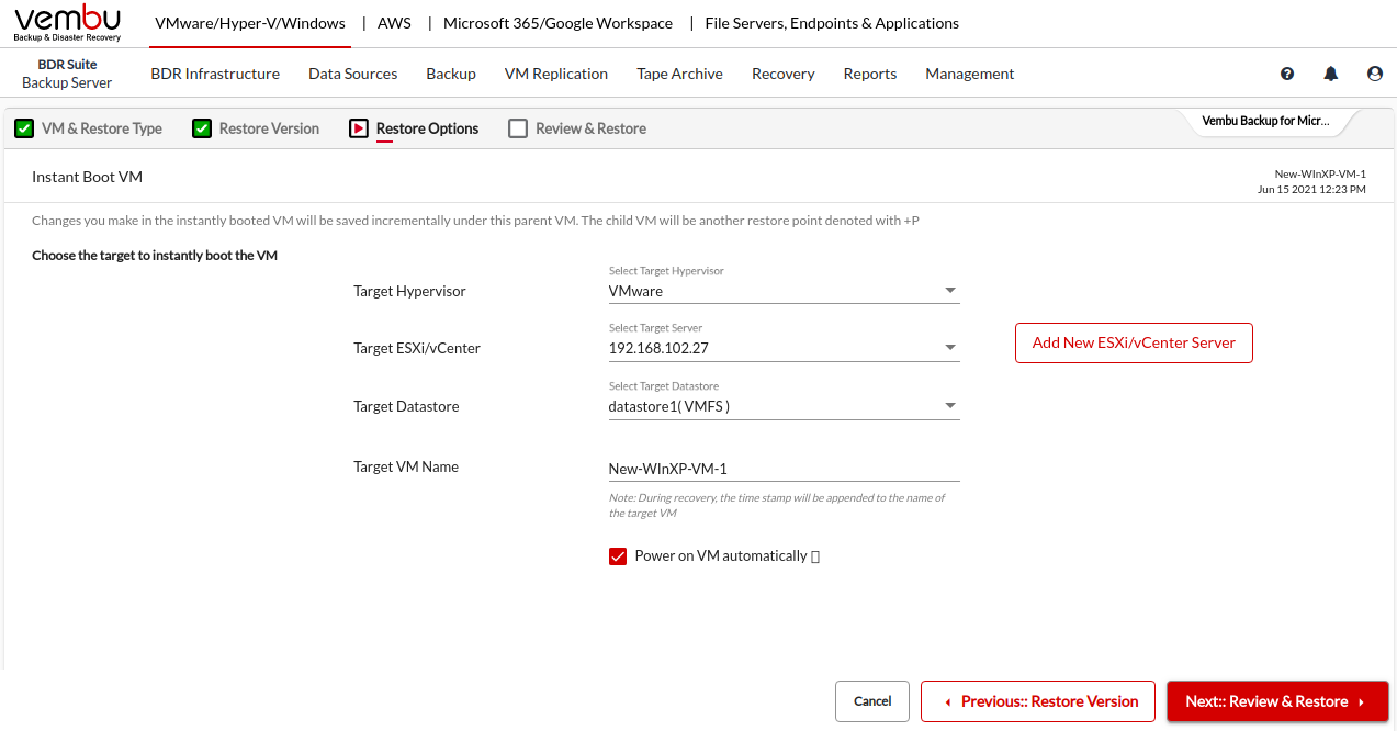 Restore to VMware Hypervisor