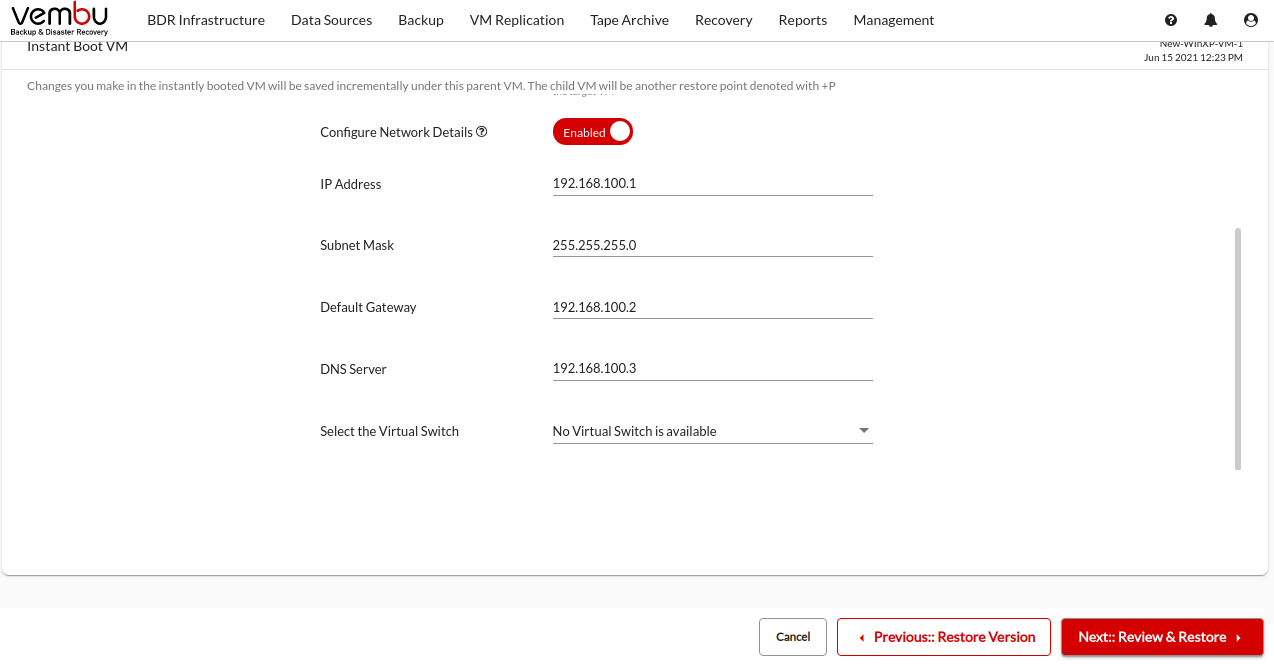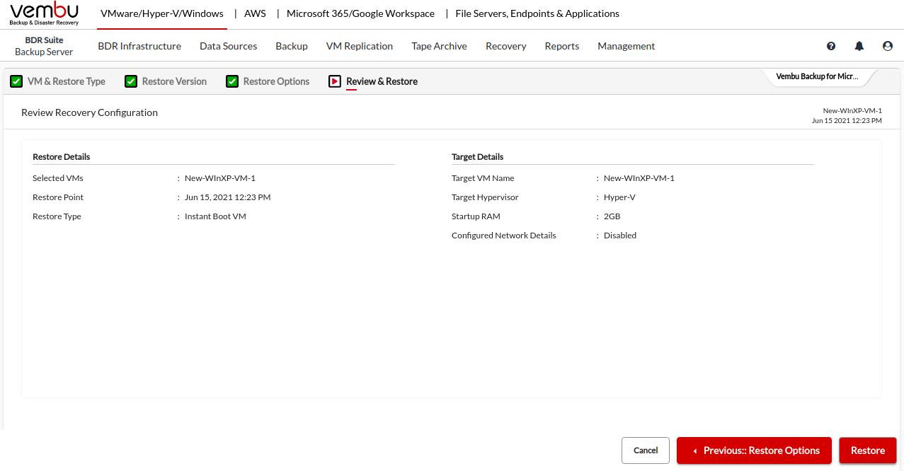 Review all the Instant Boot VM recovery configurations and click Restore to instantly boot the backup data as a VM on the selected hypervisor.