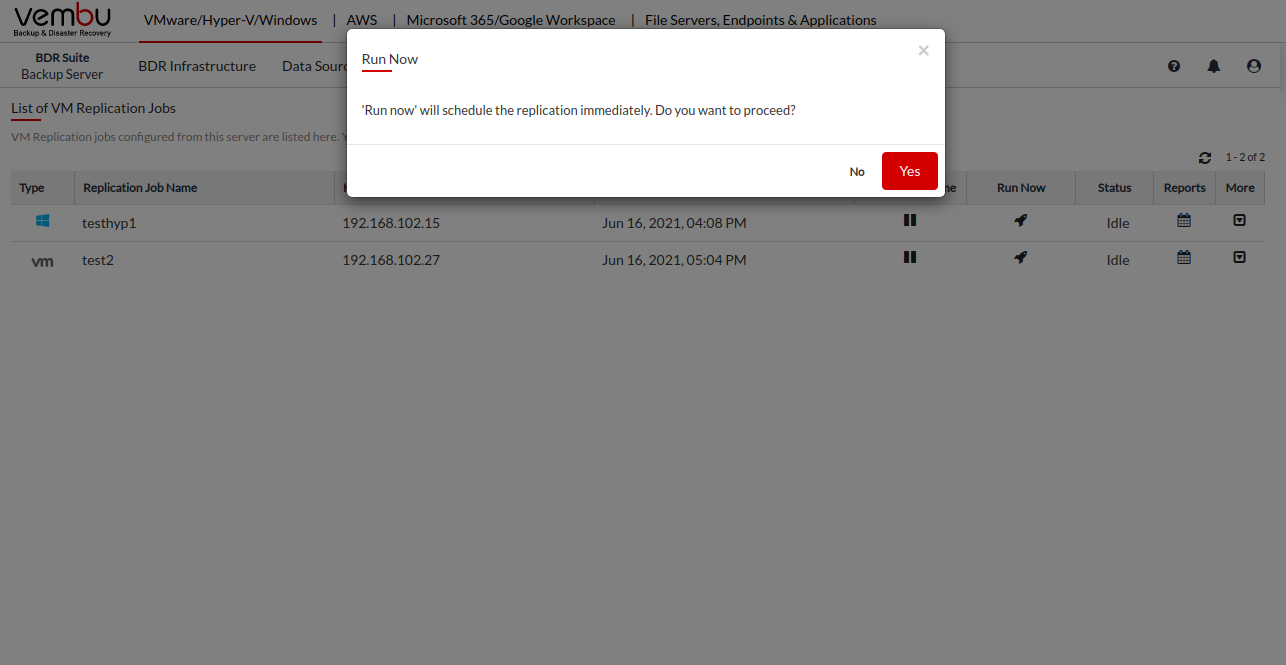 - This option will trigger the replication process immediately irrespective of the schedule. Click the Schedule Now option besides the Suspend/Resume section. In the pop-up window, click Yes.