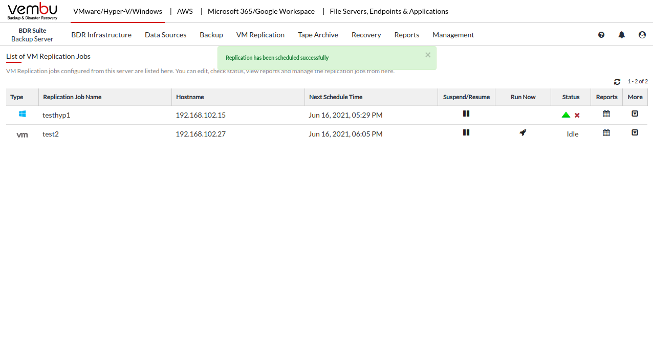 - Once you click Yes from the pop-up window, the replication will be scheduled and you will be alerted with the window displayed below.