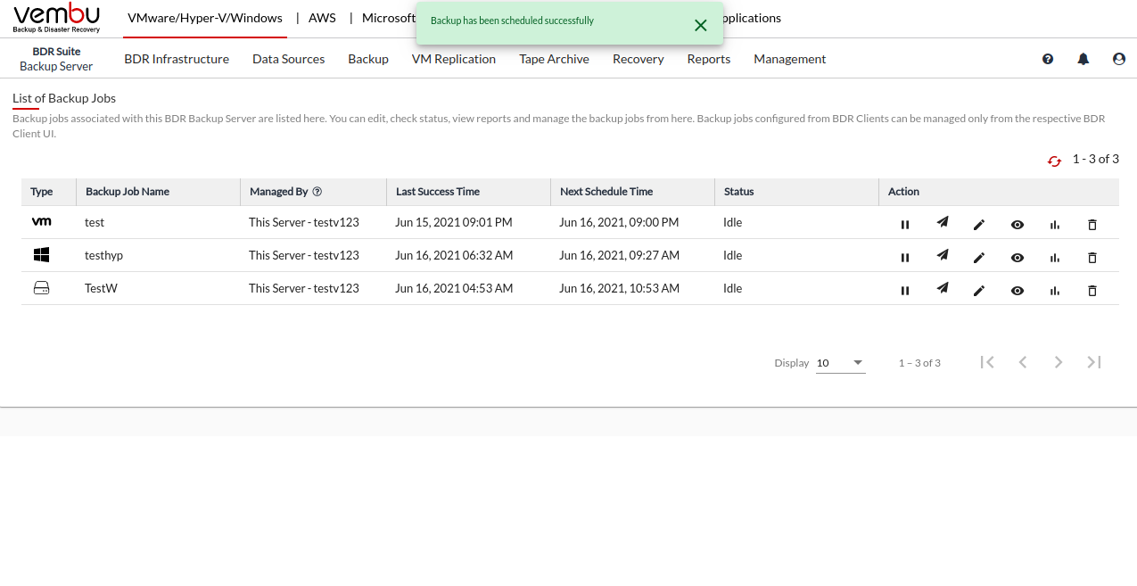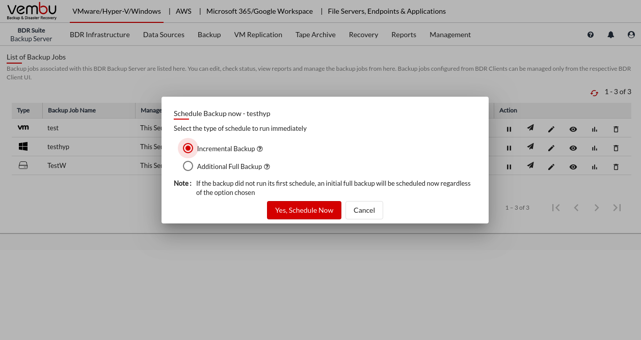 Vembu BDR Suite » Backup & Replication for Microsoft Hyper-V » Manage Backup Jobs » Schedule Now