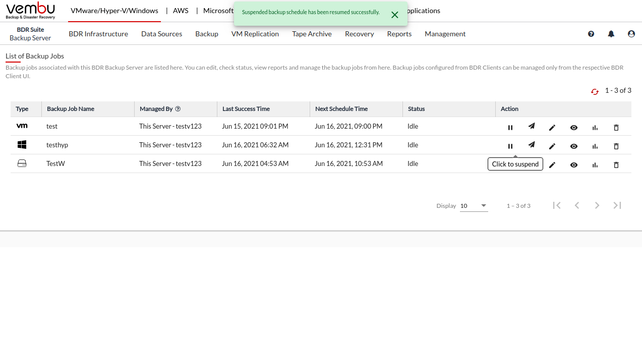 Vembu BDR Suite » Backup & Replication for Microsoft Hyper-V » Manage Backup Jobs » Suspend/Resume