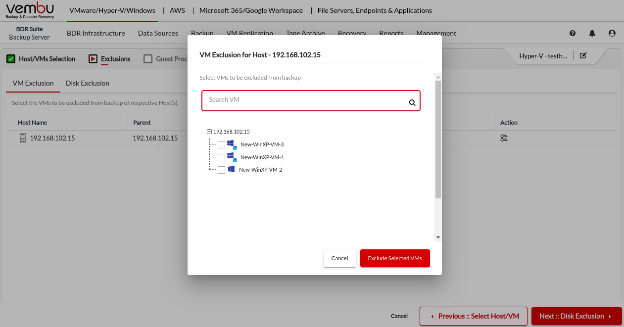 Vembu BDR Suite » Backup & Replication for Microsoft Hyper-V » Configure Backups » Specify VM/Disk Exclusion » VM Exclusion