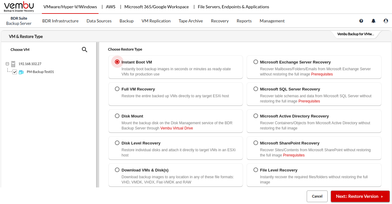 Instant Boot VM option allows you to instantly access the backup data as a ready state VM within a few minutes. With this option, you can achieve minimal downtime and ensure business continuity by making VMs instantly available.