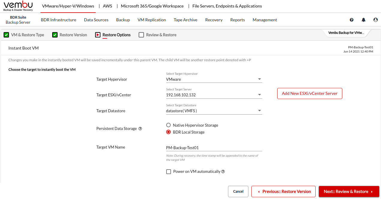 Review all the Instant Boot VM recovery configurations and click Restore to instantly boot the backup data as a VM on the selected hypervisor.