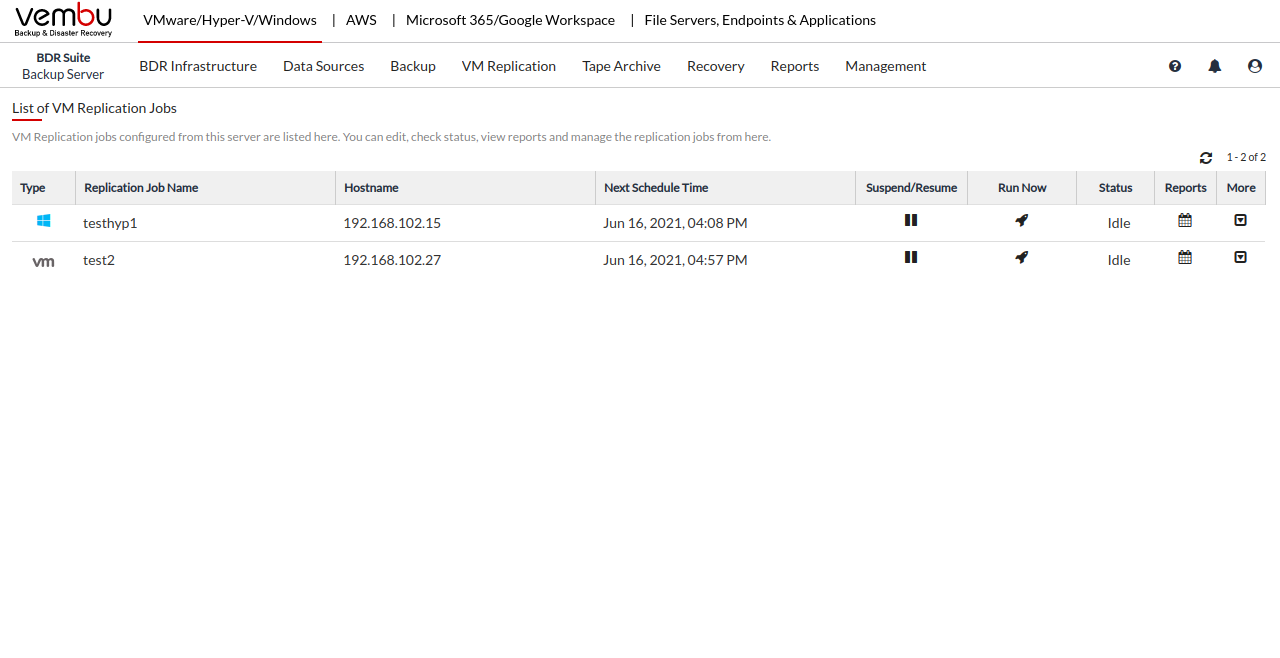 Vembu BDR Suite » Backup & Replication for Microsoft Hyper-V » Manage VM Replication Jobs