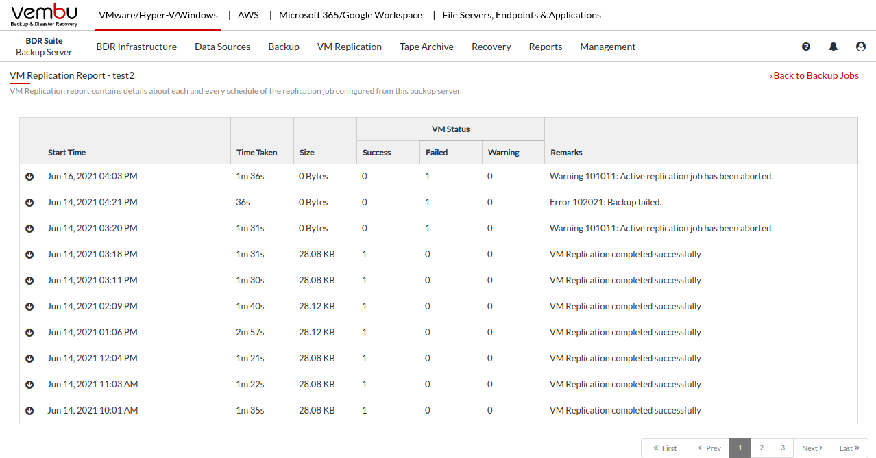 Share: vembubdrsuitebetauserguide Reports Vembu BDR Suite » Backup & Replication for VMware » Manage VM Replication Jobs » Reports Reports