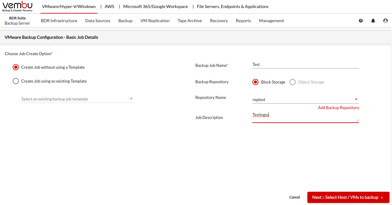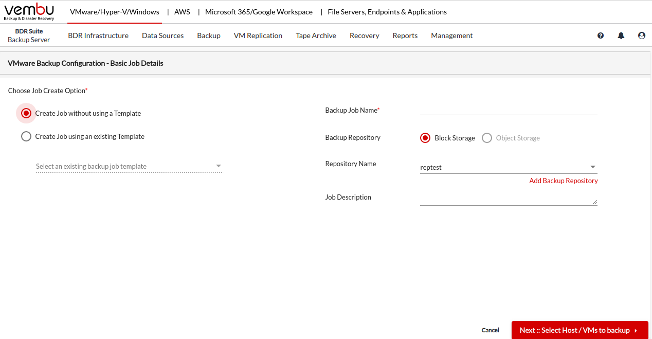 Get started by creating a backup job by choosing Job Create Option, choose to Create Job without using a template if you want to create a backup from scratch, or choose to Create Job using an existing template if you would like to use an already created template for the backup job creation.