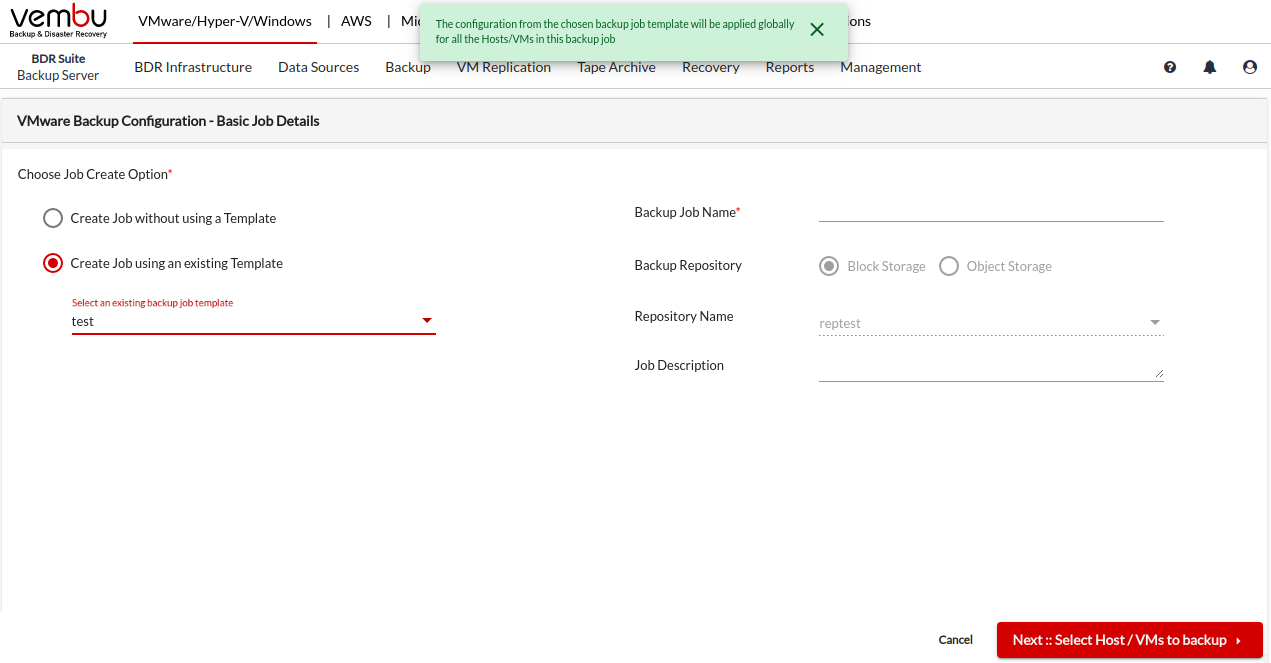If you choose to Create Job using an existing template, you have to select an already created template you want to use for this backup job. Selecting a backup job template will load the VM/Disk Exclusion, Guest VM Processing, Backup Scheduling & Job Settings from the selected template.