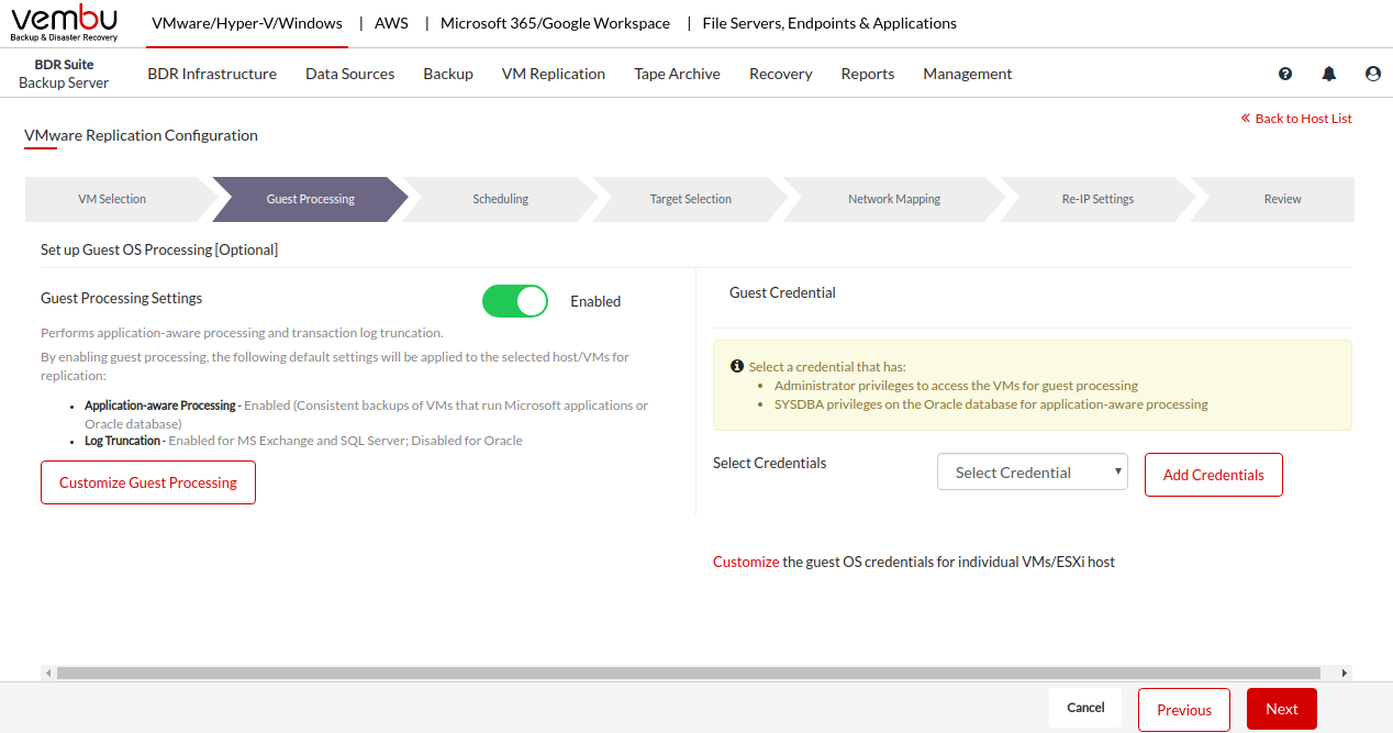 Guest OS processing allows you to configure the settings to ensure the consistency of the VMs selected for backup. You will be able to configure application-aware processing, transaction log truncation, and system file exclusion in guest OS processing settings.