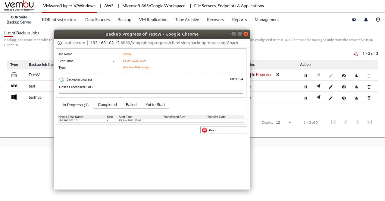 - Abort - You can abort your backup if not required, from the Abort (-) option available in the progress window.