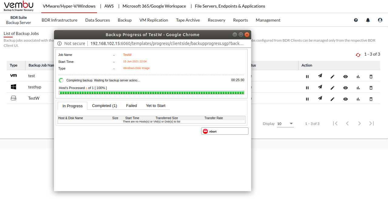 - You will be redirected to the List All Jobs page once you complete configuring the backup job. Verify the progress of your backup in the Overall Progress Window. To view the backup progress window, select the arrow mark in the Status section.