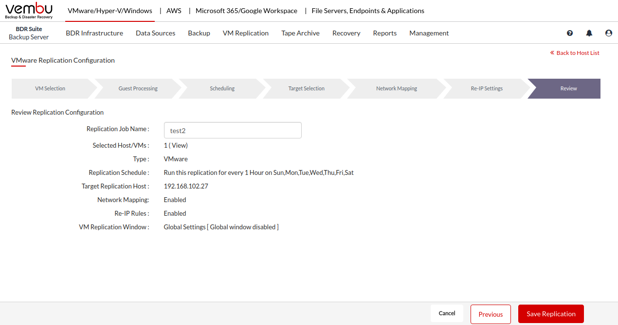 - The last step in your VMware replication configuration is to review the configurations you have selected. Enter a Replication Schedule Name. BDR Backup Server supports creating multiple replication schedules each with its own configuration. The replication schedule name will uniquely identify the replication. While restoring your replicated data, you need to choose the data to be restored using its schedule name.