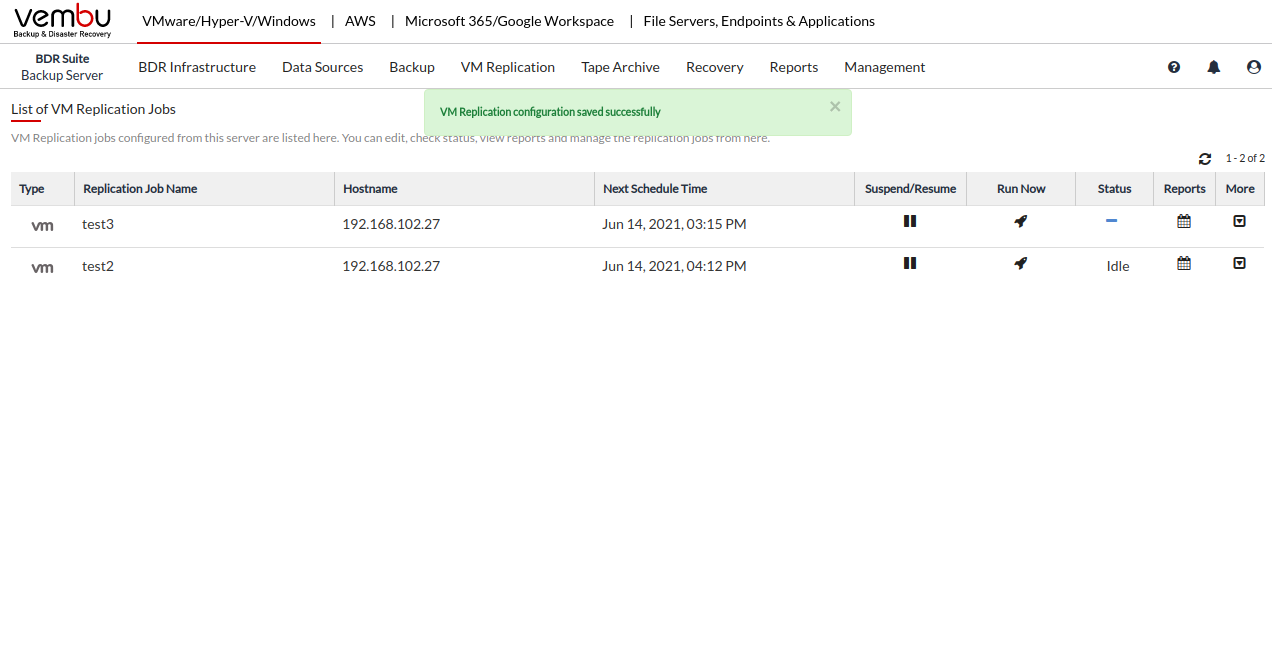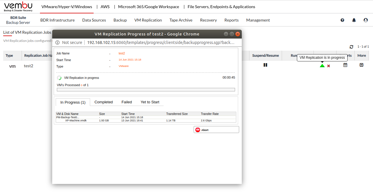 You can verify the progress of your replication in the Overall Progress window. To view the backup progress window, Go to VM Replication tab and press the List Jobs option, Click the arrow mark in the Status section.