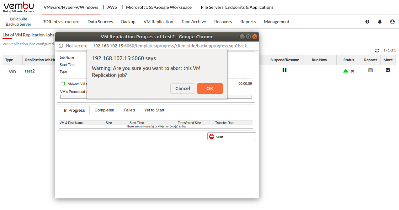 - You can abort your replication from the replication progress window. Click the Abort (-) option, you will get a pop-up as shown below. Click OK to Abort the replication.