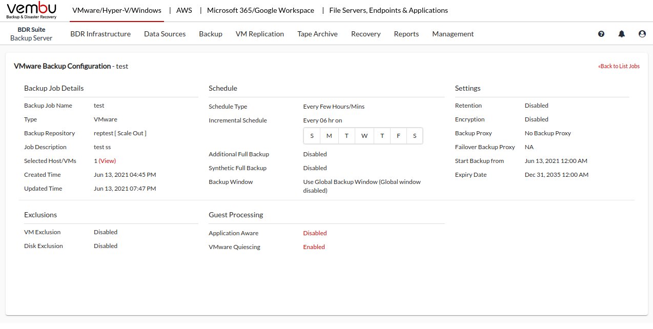 - Schedule Details will list the schedule details of that particular backup job. From the List Jobs page, select the More option and click the View option. Click the Schedule Details, the details will be available as shown below.